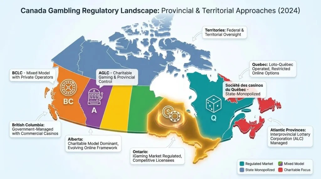 Canada doesn’t have that. Instead, gambling regulation is fragmented across provinces. Ontario has iGaming Ontario (iGO), which regulates a legitimate market. Quebec has Espacejeux run by Loto-Québec. British Columbia has PlayNow through BCLC. Alberta is somewhere in between. And then there’s a whole universe of offshore casinos operating in a legal gray area that no one really enforces against.